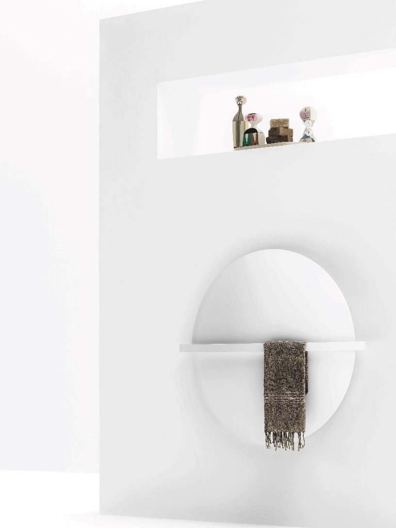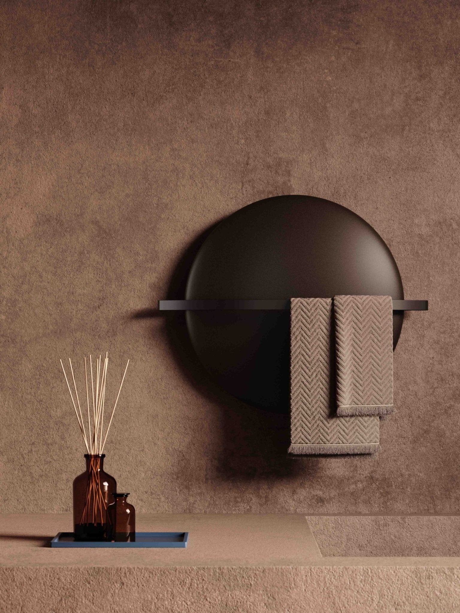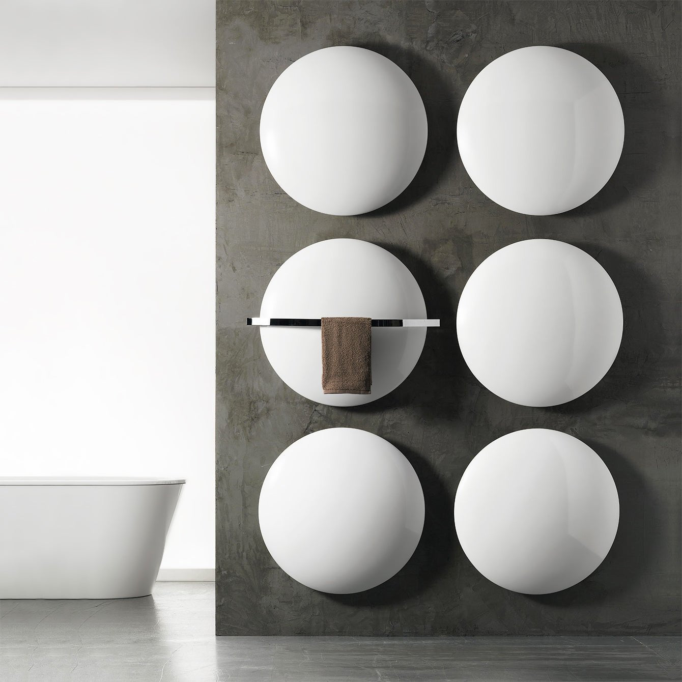 Saturn & Moon. Ein höchst statuarisches Modell von Designer Heizung im Stil des Zen Minimalismus - ruhig, nachdenklich, entspannt. Saturn birgt den Handtuchhalter (den Ring des Planeten Saturn) als prägendes Element in sich. Moon eignet sich nach Abnahme des Handtuchhalters für jede Art von Wohnraum. Saturn & Moon haben einen versteckten Anschluss zur Anlage, der dank des besonderen Befestigungssystems dennoch leicht zugänglich ist. Dieses System ermöglicht es den Heizkörper von Designer Heizung anzuheben und gleich Zugang zum Ventil und zum Regler zu verschaffen. Die kugelförmige Oberfläche des Modells Saturn & Moon nimmt das Licht im Raum auf und verfließt an den Rändern des Heizkörpers wie der "Hof" am Anfang oder am Ende einer Finsternis. Heizkörper Saturn & Moon eignen sich für jede Art von Ambiente. Sie sind perfekt als Designer Heizung für Privathäuser, Hotels, Restaurants, Kaffeehäuser, Clubs, Bars, entlang der Korridore, in Flughäfen, am Bord von Yachten und Kreuzfahrtschiffen, sowie in kleinen, engen Badezimmern.