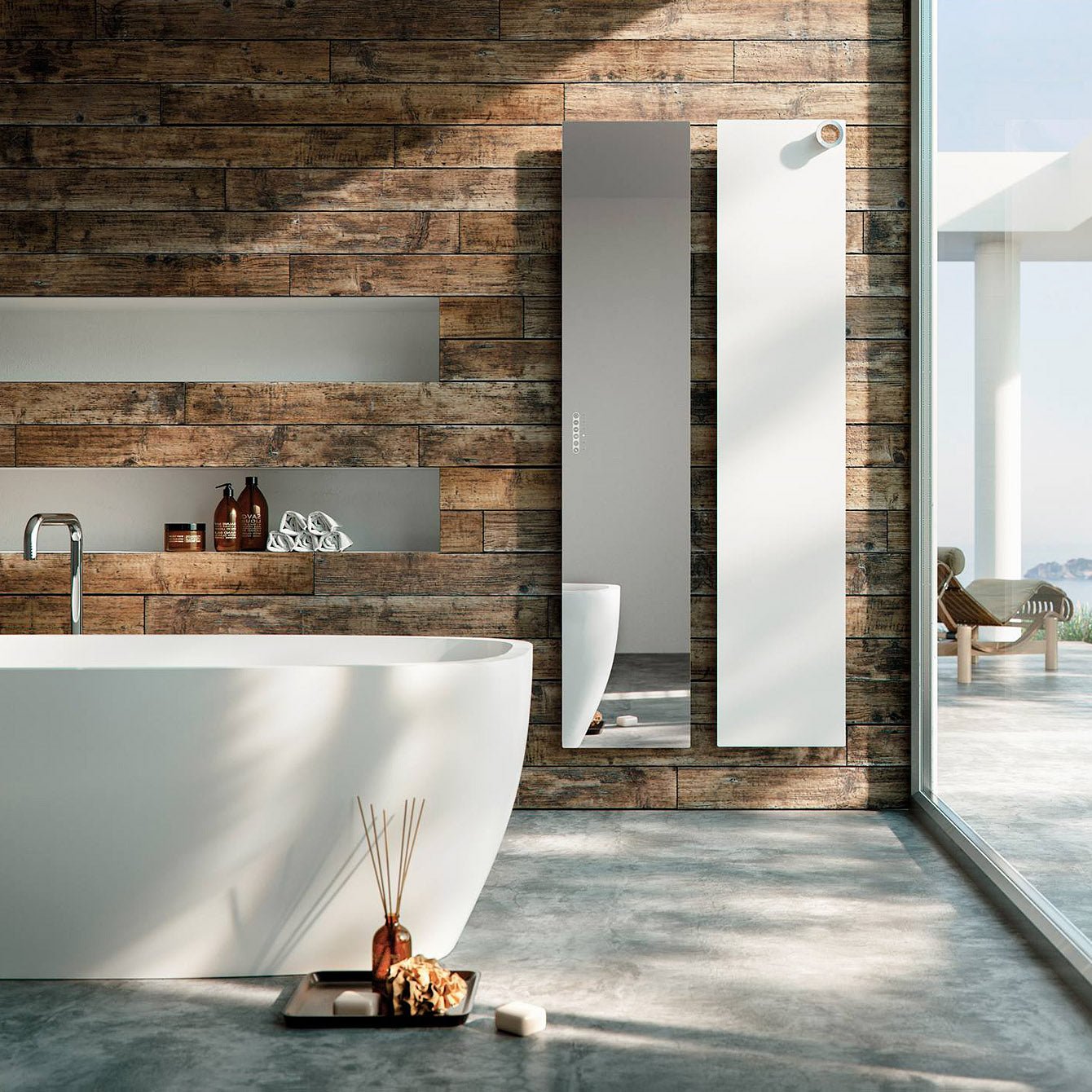 Der Elektroheizkörper Bad Tavola Total Mirror ist eine Kombination aus Spiegel und Heizkörper. Er ist ein wärmender Spiegel, der durch moderne Technologie und ehrgeizige Entwürfe überrascht. Der Elektroheizkörper Bad Tavola Total Mirror ist 171 cm x 35 cm groß und ragt nur 7 cm von der Wand hervor. Man kann ihn horizontal und vertikal montieren. Er hat eine Leistung von 700 Watt und kann über den Touchscreen eingestellt werden. Eine Fernbedienung steuert die Temperatur.
