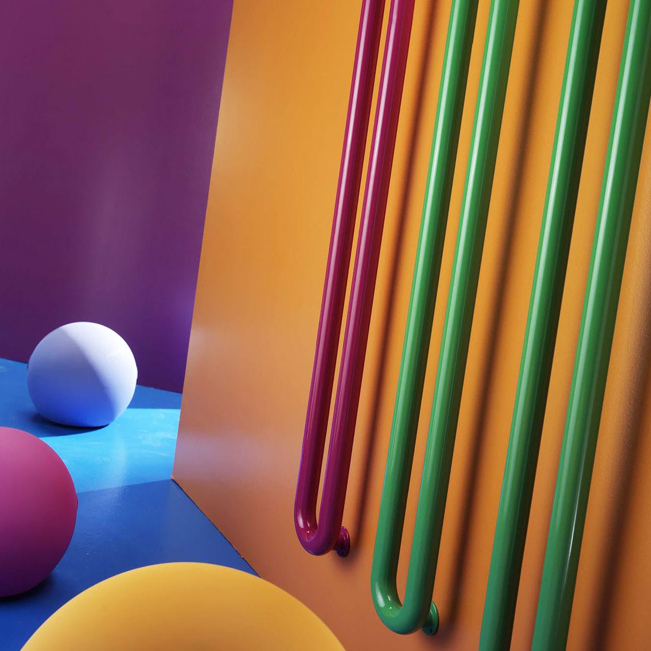 Man kann ihn senkrecht oder waagerecht montieren, zum Beispiel am Boden gegenüber einem Glasfenster oder als Sitzbank. Es gibt auch eine Version mit Strom. In der vertikalen Form hat er eine Stange zum Aufhängen von Handtüchern. So kann man auch in kleinen Räumen einen Handtuchwärmer nutzen. Es gibt über 200 Farben für den Heizkörper und den Handtuchhalter. Man kann sie einzeln oder zusammen verwenden.