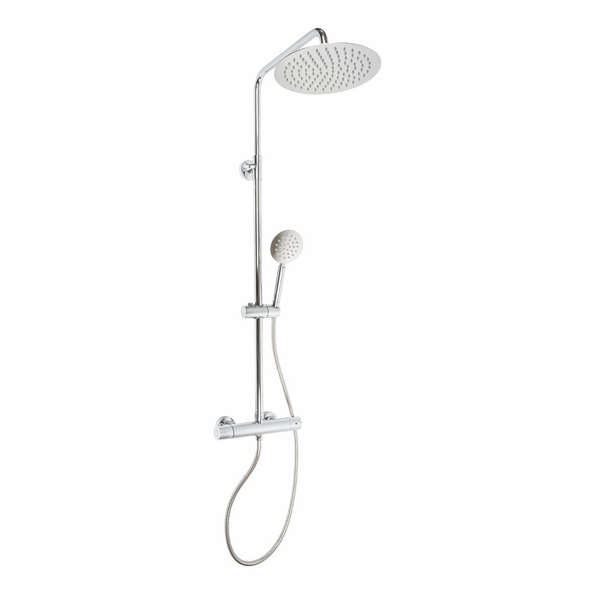 Duschsäule mit thermostatischem Mischer aus Messing, der die Aufrechterhaltung der Wassertemperatur gewährleistet. Die Stange aus verchromtem Stahl verfügt über verstellbare Anschlüsse und kann in der Höhe um bis zu 35 cm verlängert werden. Der Duschkopf mit einem Durchmesser von 25 cm ist aus Edelstahl AISI 304 gefertigt, ebenso wie die Handbrause mit einem Strahl, und beide sind mit Silikondüsen ausgestattet, die eine einfache Entfernung von Kalkablagerungen ermöglichen. Dank der Anwendung einer zusätzlichen Dichtung, die im Paket enthalten ist, kann der Wasserverbrauch um bis zu 40 % reduziert werden.