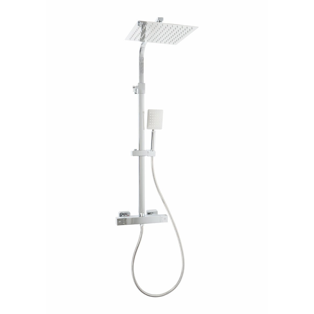 Duschsäule mit thermostatischem Mischer aus Messing, der die Aufrechterhaltung der Wassertemperatur gewährleistet. Der Duschkopf und die Handbrause mit einem Strahl sind aus Edelstahl AISI 304 gefertigt und mit kalkabweisenden Silikondüsen ausgestattet. Höhenverstellbare Stange aus verchromtem Stahl mit Wandbefestigungen, Achsabstand 68 cm, teleskopisch mit einer Höhe von 73,5 - 111,5 cm. Flexschläuche aus Edelstahl mit doppelter Verpressung. Durch die Anwendung der mitgelieferten Spezialdichtung kann der Wasserverbrauch je nach Druck reguliert werden, wobei der Durchfluss auf maximal 9 l/min begrenzt wird.