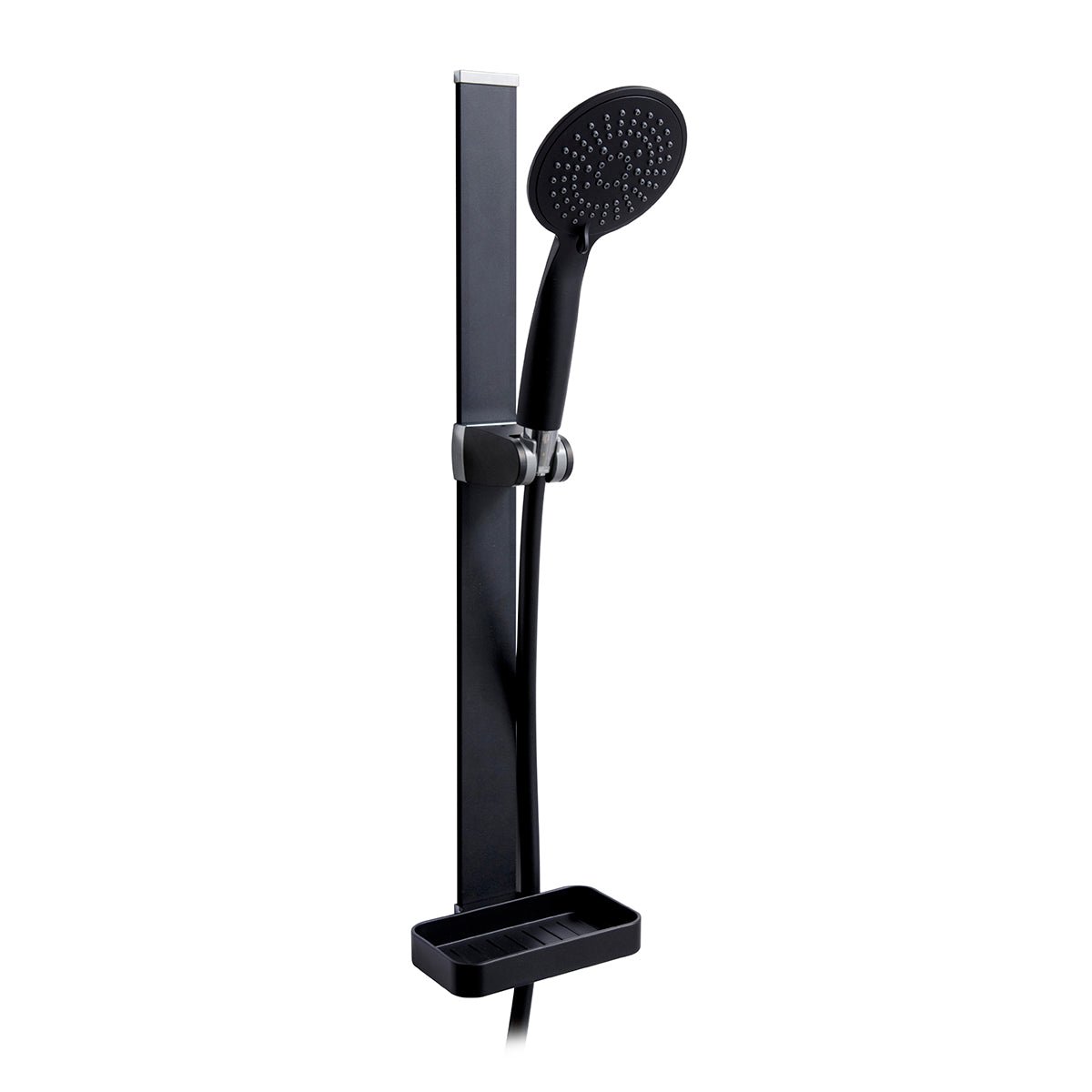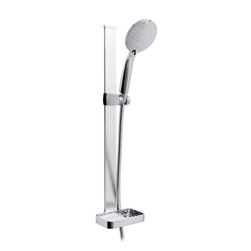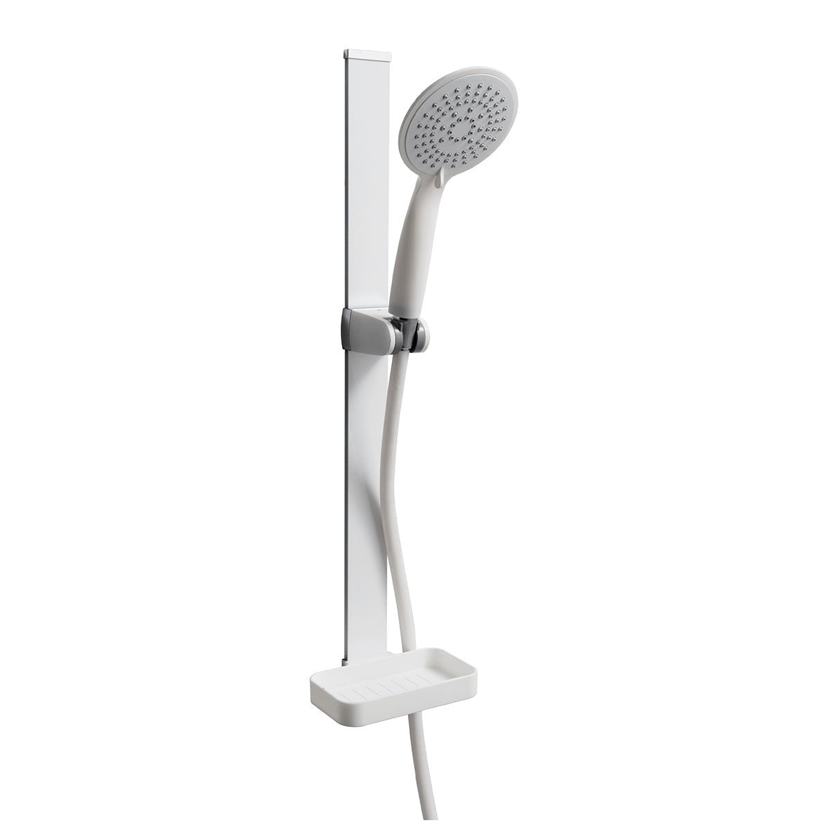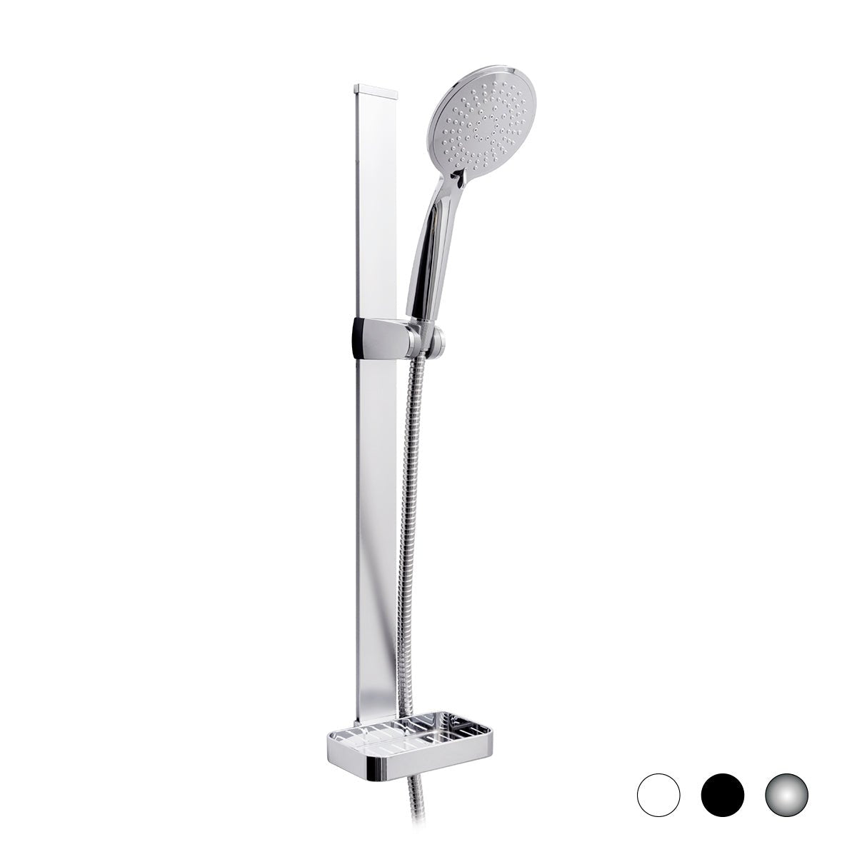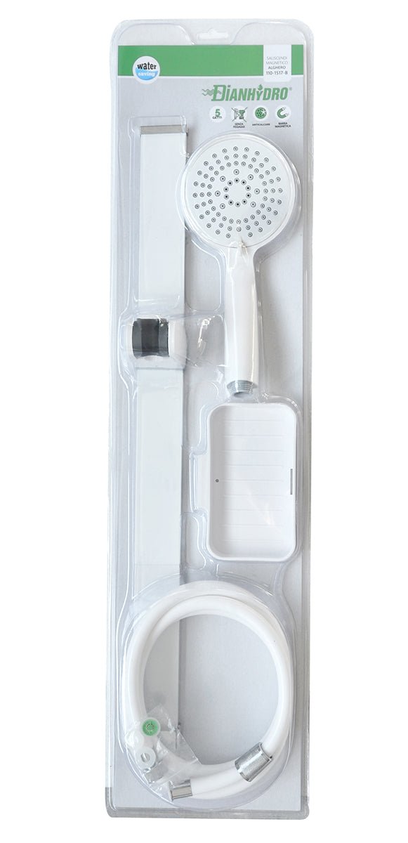 Magnetische Duschgleitstange bestehend aus: Handbrause mit 5 Funktionen aus ABS, wassersparend, Durchmesser 110 mm, flache Stange aus Aluminium. Magnetische Halterung aus gleitfähigem ABS. Duschschlauch Länge 150 cm, mit Seifenhalter. Gesamthöhe 60 cm, Befestigung mit beiliegendem doppelseitigem Klebeband.
