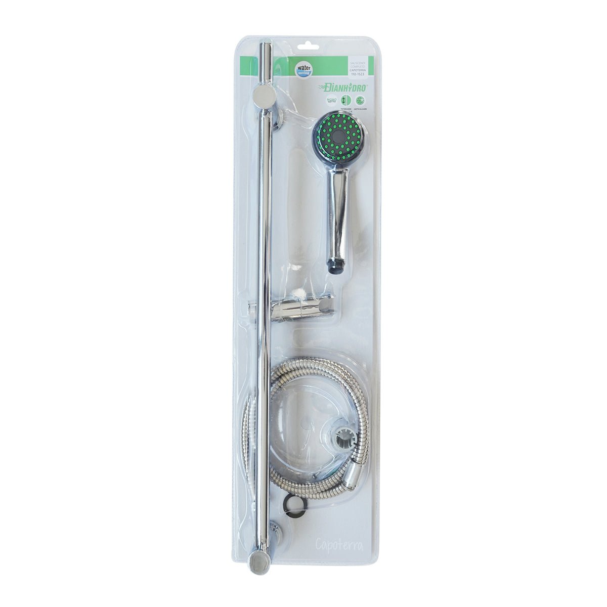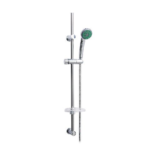 Duschset bestehend aus: Einzelfunktions-Handbrause, Durchmesser 71 mm mit Wassersparfunktion. Duschschlauch Länge 150 cm aus Edelstahl. Verstellbare obere Stangenhalterung. Stange aus Edelstahl, Durchmesser 19 mm, mit Seifenablage. Gesamthöhe 64,5 cm. Chromoberfläche.