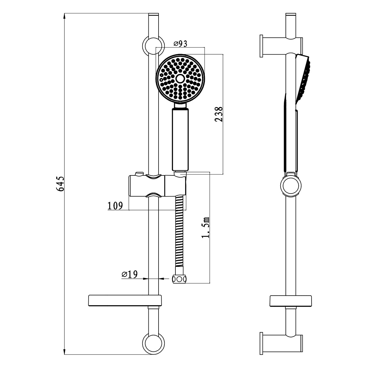 Duschstangenset bestehend aus: Handbrause mit 5 Funktionen, Durchmesser 93 mm, mit Wassersparfunktion. Brauseschlauch 150 cm aus Edelstahl, verstellbare obere Halterung. Stange aus Edelstahl, Durchmesser 19 mm, mit Seifenablage. Gesamthöhe 64,5 cm. Chromoberfläche.