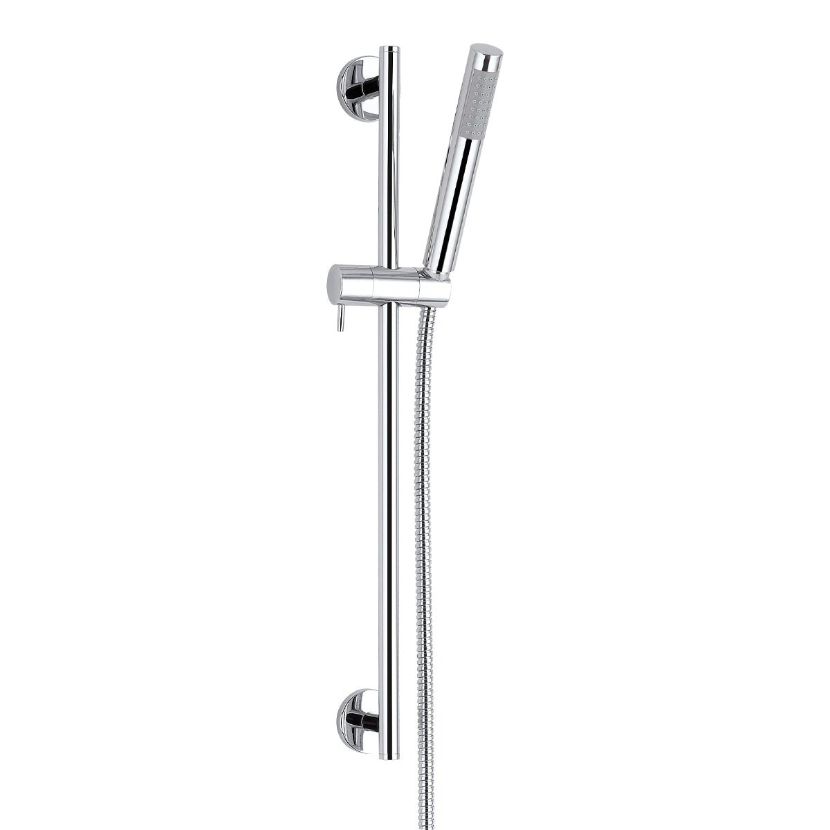 Duschstange bestehend aus: Einzelfunktions-Handbrause aus ABS, Durchmesser 30 mm, Brauseschlauch aus Edelstahl, Länge 109 cm. Duschstange aus Edelstahl, Durchmesser 18 mm. Höhenverstellbarer Brausehalter. Gesamthöhe 60 cm. Chromoberfläche.
