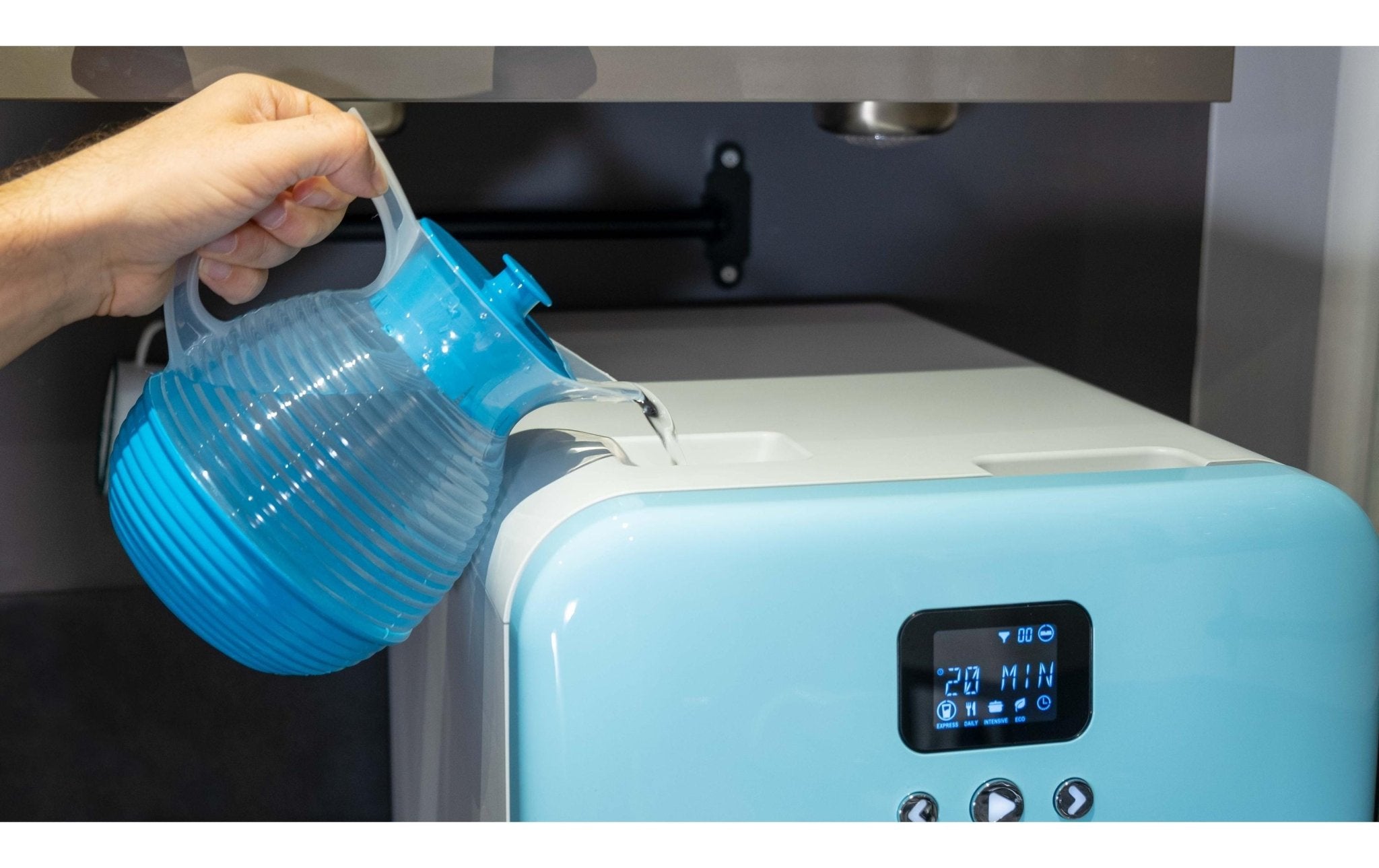 Bob, der praktische Geschirrspüler, bietet zwei Optionen der Wasserzufuhr. Entscheiden Sie sich entweder dafür, ihn wie einen herkömmlichen Geschirrspüler an einen Wasseranschluss anzuschliessen oder nutzen Sie den integrierten Wassertank, der Bob unabhängig von einem Wasseranschluss macht. Der Wassertank, ähnlich einer Kaffeemaschine, wird an der Vorderseite befüllt. Dadurch können Sie Bob entweder integrieren oder unter einer Spüle platzieren. Die Entleerung des Schmutzwassers erfolgt mithilfe einer Ablaufpumpe und eines Schlauchs. Sie können den Schlauch direkt in die Spüle, einen Eimer, Kanister oder Abwasserauslass legen. Beachten Sie dabei, dass die maximale Entleerungshöhe 1.20 m beträgt. Mit nur 2.9 Litern pro Express-Zyklus verbraucht Bob deutlich weniger Wasser als beim manuellen Spülen von Hand (15 Liter für die gleiche Menge Geschirr).