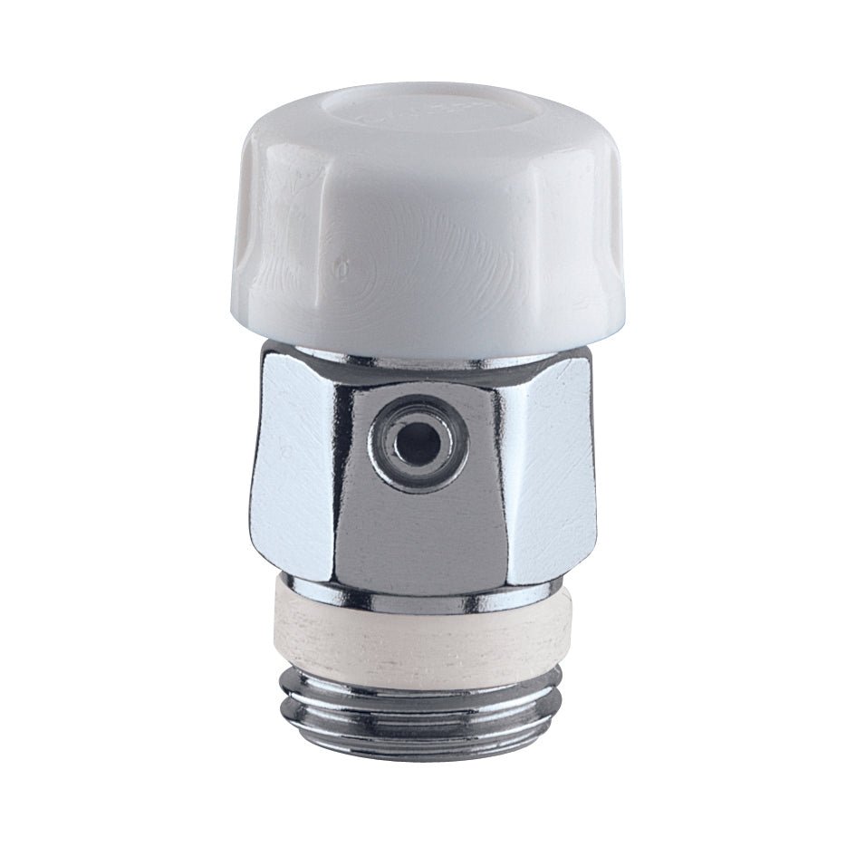 Luftablassventil für Heizkörper mit Gummidichtung. Weisser Kunststoffgriff. PTFE-Dichtgewinde. Max. Druck 10 bar. Max. Temperatur 90°C.