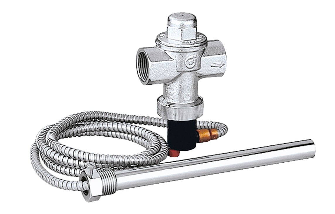 Thermisches Sicherheitsablassventil mit doppelt gesichertem Sensor für Festbrennstoffgeneratoren. Max. Betriebsdruck: 10 bar. Einstelltemperatur 95°C. Zertifiziert nach EN 14597.