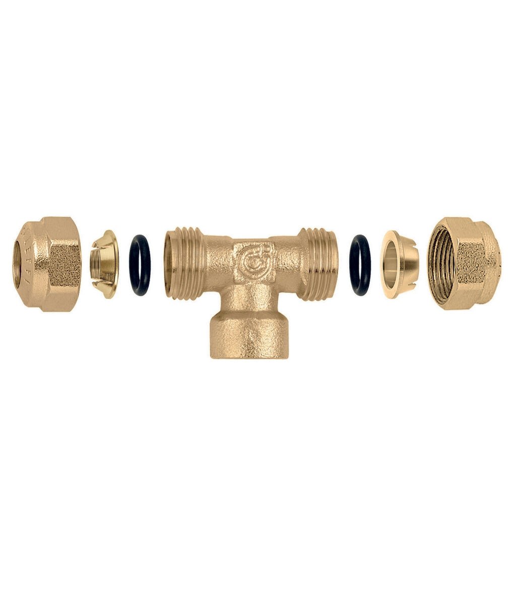 Weibliche T-Stückverbindung für Kupferrohre gemäss der Norm UNI EN 1254-2. Schwarzer O-Ring gemäss der Norm EN 681.1.