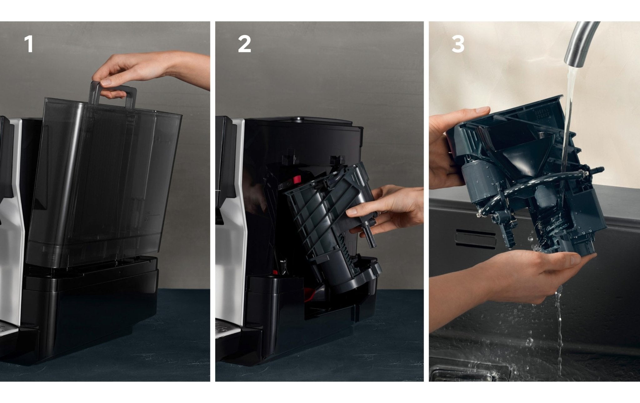 Auch im Milchaufschäumer und den Milchleitungen können sich bei vernachlässigter Reinigung Keime bilden und festsetzen, die dann in der nächsten Tasse Kaffee landen. Daher ist es wichtig, auch diese Bestandteile der Maschine regelmässig auf ihre Sauberkeit zu kontrollieren. Wenn optisch alles sauber aussieht, ist das in der Regel ein gutes Zeichen, während sichtbare Verkrustungen auf eine nötige Reinigung hinweisen. Einige Kaffeemaschinen führen die Reinigung des Milchsystems automatisch nach jeder Nutzung durch oder können so programmiert werden, bei anderen müssen Sie die Reinigungsfunktion über Tastendruck oder eine Menüauswahl manuell auslösen.