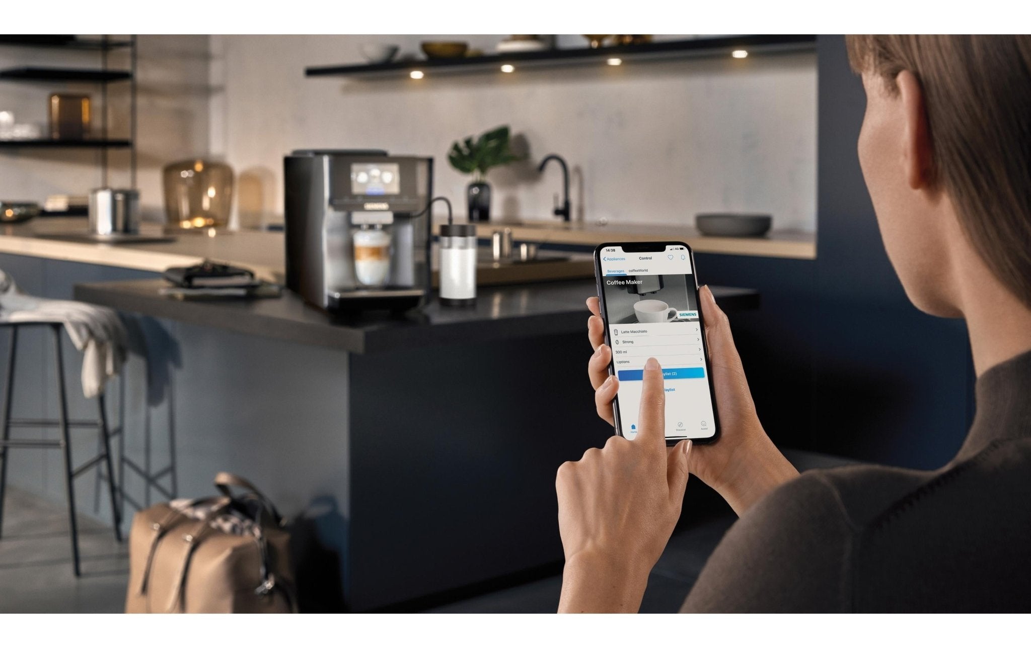 Mit «Home Connect» ist es Ihnen möglich, den Kaffeevollautomaten in Ihrer Küche von überallher zu steuern. Bestellen Sie sich gemütlich vom Sofa aus Ihren Lieblingskaffee. Oder lassen Sie sich am Morgen noch im Bett Ihren Kaffee zubereiten, damit Sie Ihn gleich geniessen können, wenn Sie in die Küche gehen. Wenn Sie Gäste zu Hause haben, können Sie eine «Playlist» mit verschiedenen Kaffees erstellen, die dann so zubereitet werden, dass Sie sie nur noch zu verteilen brauchen. Sie haben dabei die Wahl aus einer Vielzahl klassischer Kaffeespezialitäten sowie weiterer Kaffeekompositionen aus der ganzen Welt. Mit der «Home Connect» App werden Sie zur Kaffee-Expertin oder zum Kaffee-Experten! Holen Sie sich Ihr Know-how direkt aus der App, etwa zu den verschiedenen Kaffeesorten und ihrer Herkunft. Auch der Service wird mit «Home Connect» vereinfacht. Rufen Sie einfach die Hotline an und lassen Sie eine Ferndiagnose durchführen. Der Kundendienst greift – natürlich nur mit Ihrer Erlaubnis – auf Ihren Kaffeevollautomaten zu und kann auf diese Weise im Idealfall die Ursachen allfälliger Probleme ermitteln und konkrete Lösungsansätze anbieten, mit denen Sie Ihre Kaffeemaschine ohne grossen Aufwand reparieren.