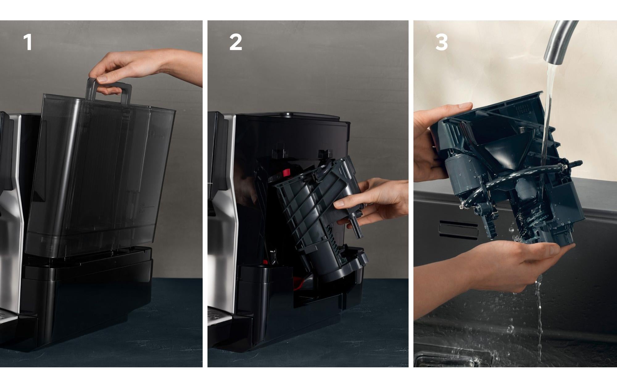 Auch im Milchaufschäumer und den Milchleitungen können sich bei vernachlässigter Reinigung Keime bilden und festsetzen, die dann in der nächsten Tasse Kaffee landen. Daher ist es wichtig, auch diese Bestandteile der Maschine regelmässig auf ihre Sauberkeit zu kontrollieren. Wenn optisch alles sauber aussieht, ist das in der Regel ein gutes Zeichen, während sichtbare Verkrustungen auf eine nötige Reinigung hinweisen. Einige Kaffeemaschinen führen die Reinigung des Milchsystems automatisch nach jeder Nutzung durch oder können so programmiert werden, bei anderen müssen Sie die Reinigungsfunktion über Tastendruck oder eine Menüauswahl manuell auslösen.