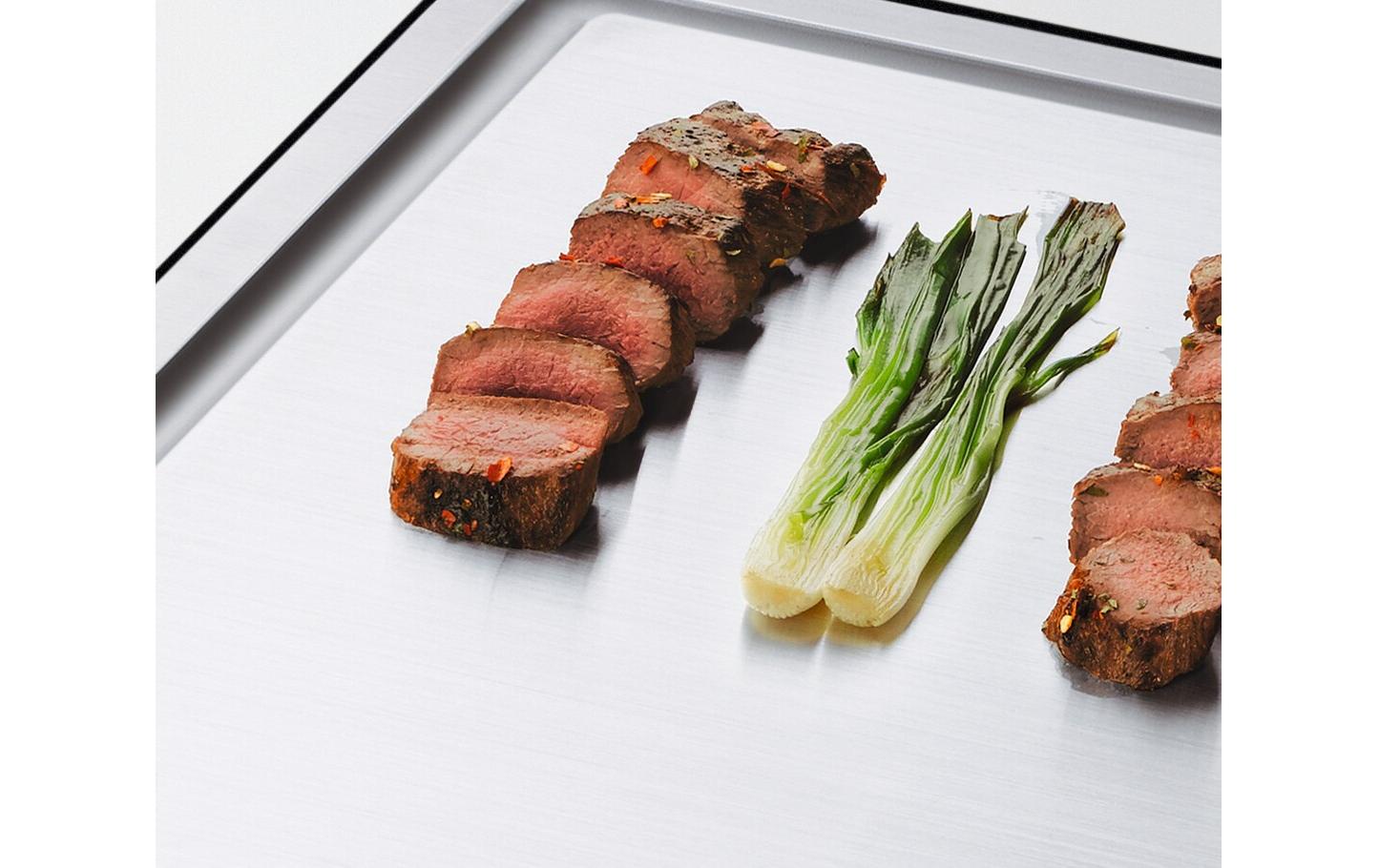 Der Teppan Yaki hat zwei separat einstellbare Temperaturzonen, sodass Sie zwei Gerichte gleichzeitig kochen können.