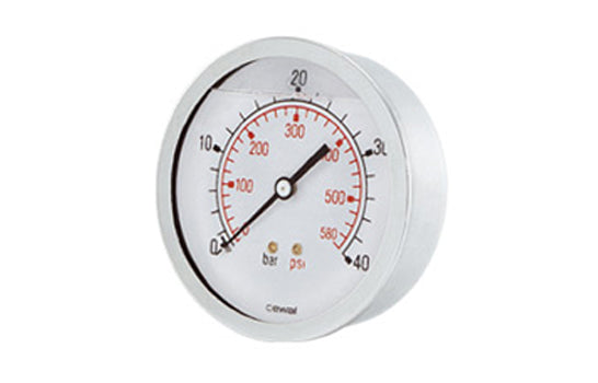 Anwendung: Druckmessung von flüssigen und gasförmigen Medien, sofern nicht hochviskos oder kristallisierend. Gehäuse und Ring aus Edelstahl AISI 304, Scheibe aus Polycarbonat, Füllflüssigkeit: bidestilliertes Glyzerin.