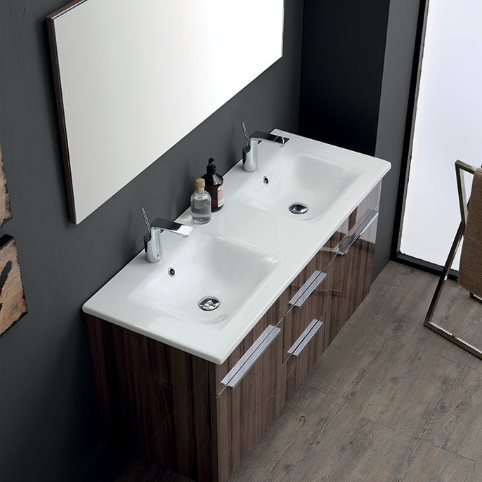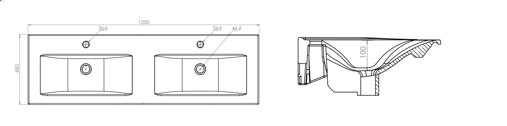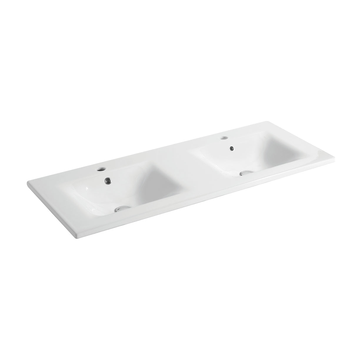 Doppelte Keramikkonsole mit Überlauf, mit Hahnlochbohrungen. Ablaufventile nicht enthalten. Farbe Weiss.