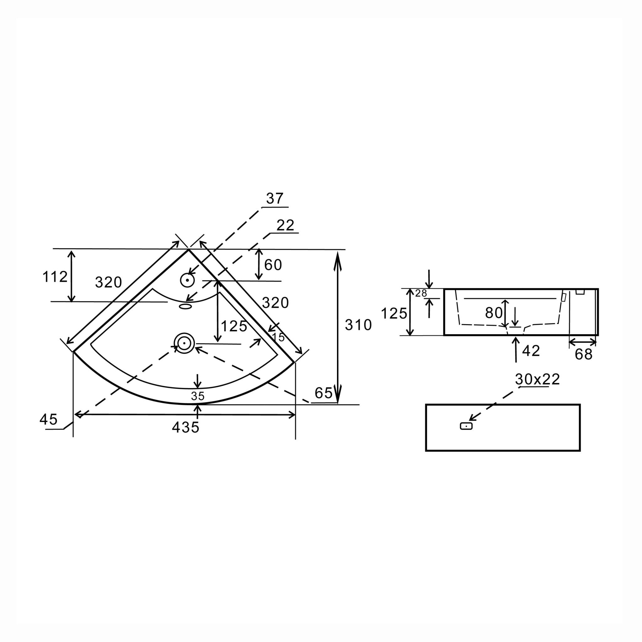 In weisser Keramik. Höhe 12,5 cm. Mit Überlauf. Wandhängende Eckinstallation. Ohne Ablaufgarnitur geliefert.