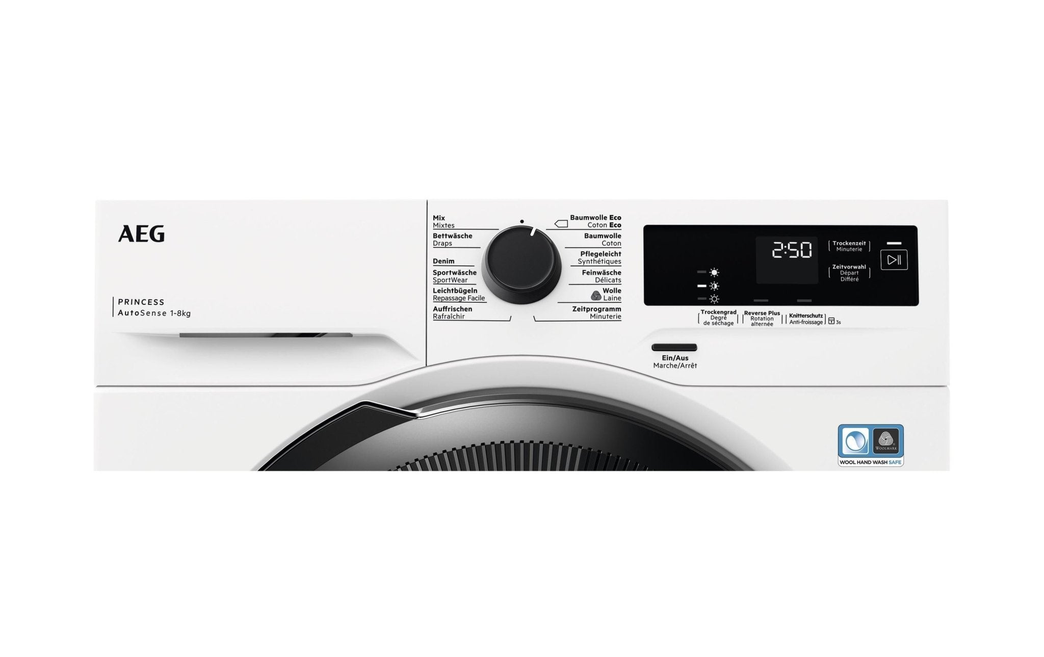• Funktionen: Knitterschutzfunktion, Restzeitanzeige, Reversierautomatik, Startzeitverzögerung, Zeitprogramm