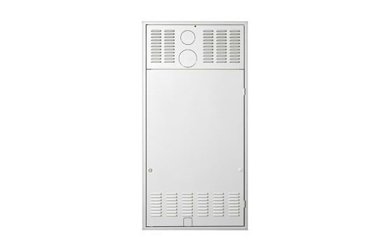 Coque en tôle galvanisée avec porte et verrou de fermeture pour Cerapur Encastré. Composé d'un cadre avec dossier, deux renforts transversaux internes, une tôle perforée frontale supérieure et un panneau perforé frontal. Dimensions (PxLxH [mm]) = 250 x 600 x 1.200