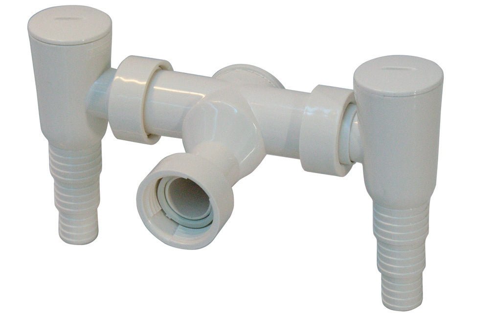 Double raccord pour deux machines à laver, avec dispositif anti-refoulement pour empêcher que le drainage d'une machine ne se termine dans la tuyauterie de la seconde. Couleur blanche; raccordement à la courbe technique 1"; diamètre 25/22/19.