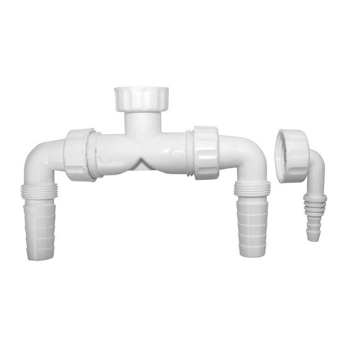 Raccord double pour deux machines à laver ou machine à laver/sèche-linge. Raccord 1". En polypropylène. Température de fonctionnement : -5 °C / +90 °C. Avec vanne anti-retour. Distance entre les deux raccords de machine à laver 151 mm.