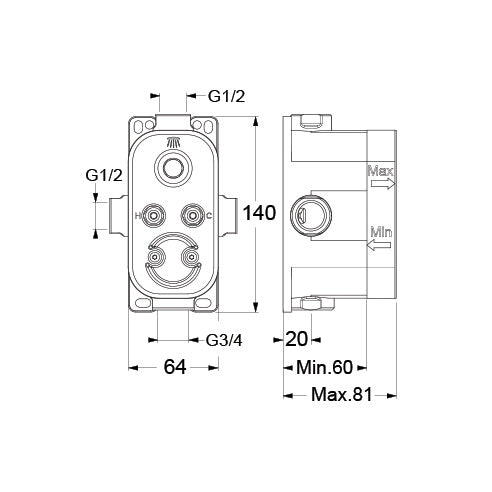Partie encastrée universelle pour mitigeurs monocommandes ou thermostatiques baignoire-douche 140x64, avec anti-bruit et anti-humidité, fermeture de l'eau chaude et froide à l'entrée avec filtres inspectables