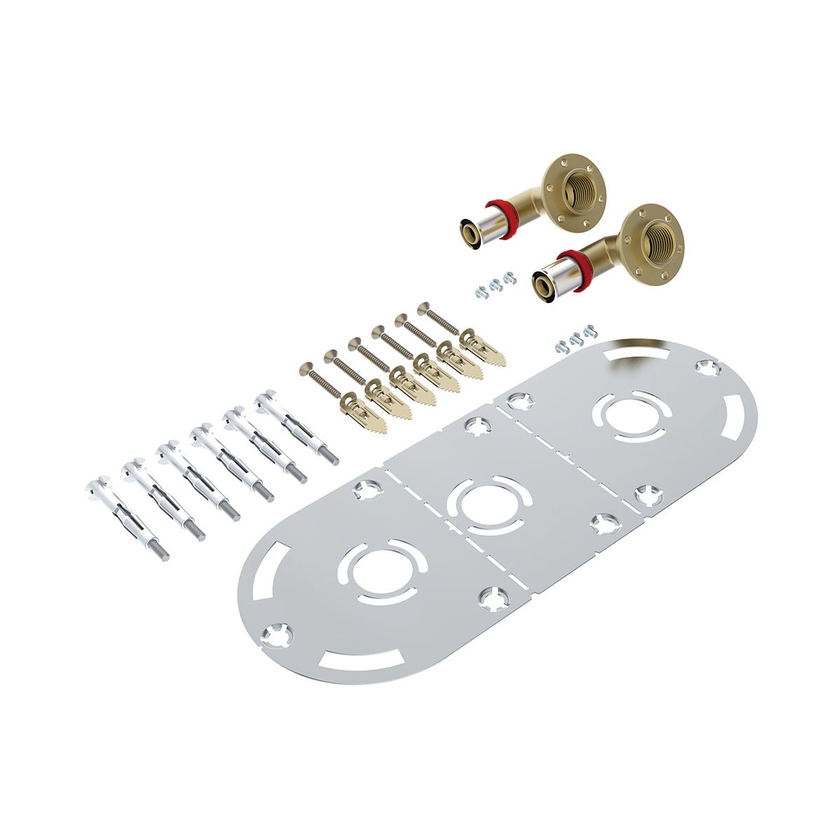 Gabarit de fixation murale, avec un ensemble de vis de fixation et deux raccords à presser courbes femelles avec bride, en laiton CW617N. Universel pour les profils de sertissage TH-U-H.