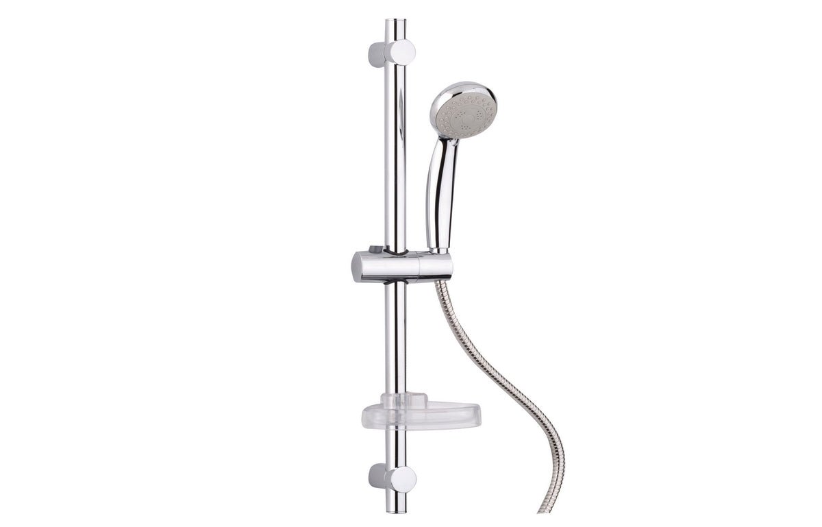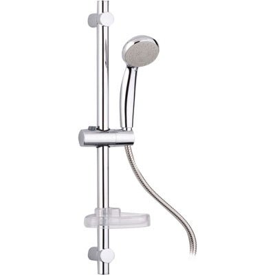 Ensemble de douche composé de : Barre en acier inoxydable chromé de diam. 25, porte-savon ; Flexible de douche de 150 cm ; Douchette à 3 jets anticalcaire ; avec emballage sous blister.