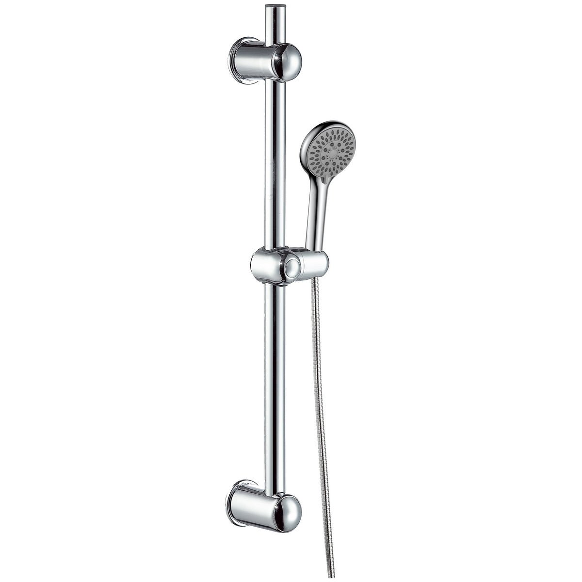 Barre de douche composée de : tige en acier chromé de 64 cm de long et de 24 mm de diamètre, douchette à 3 jets, flexible de douche de 150 cm. Fixation supérieure réglable. L'entraxe variable permet d'utiliser les trous des installations précédentes, évitant ainsi, en cas de remplacement de la tige, de percer à nouveau les carreaux.