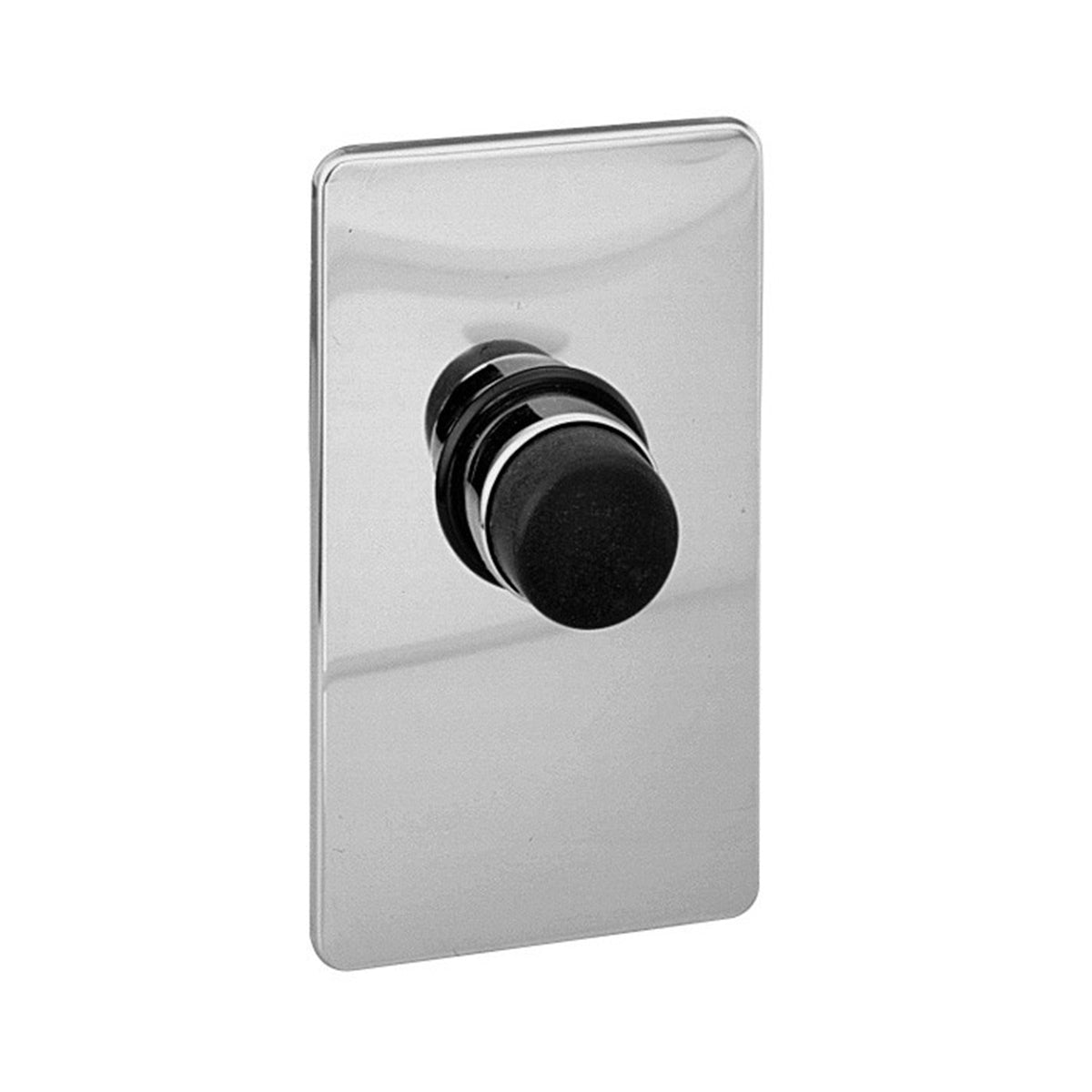 Finition : Chrome. Débitmètre encastré G. 3/4" pour WC avec bouton en plastique. Bouton noir. Composé d'une partie brute et d'une partie extérieure de finition. Corps : laiton moulé. Bouton : hostaform. Rosace en laiton en tôle dimensions 150x85 mm