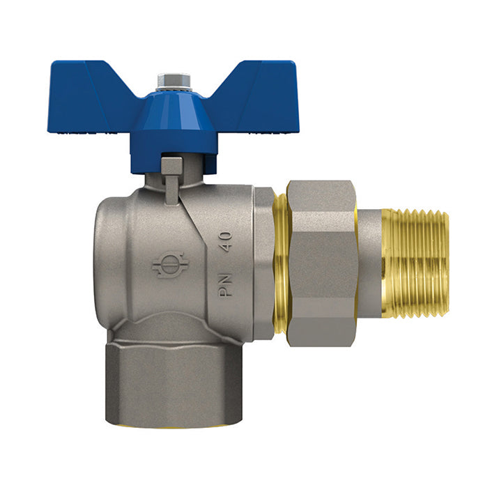 GP 2240. Vanne à boule à angle Femelle-Bochette nickelée, avec papillon en aluminium peint en bleu. Passage Total.