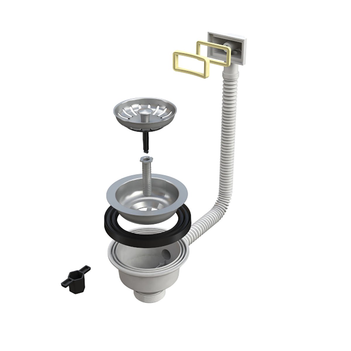 Flasque D. 3"1/2, raccord bonde 1"1/2, vis en laiton. Application : pour éviers de cuisine avec trou D. 90 mm. Matériau : inox + polypropylène PP.