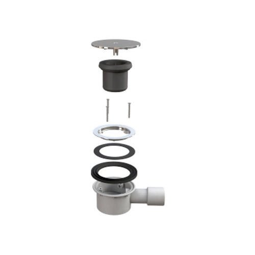TRIGONO siphon pour receveurs de douche avec trou D.90 mm. Bonde avec flasque inox sans attaches pour couvercle. Couvercle en ABS revêtu d'acier inoxydable D. 120 mm. Évacuation 40/50 mm à emboîter. Matériau : PP-Inox.