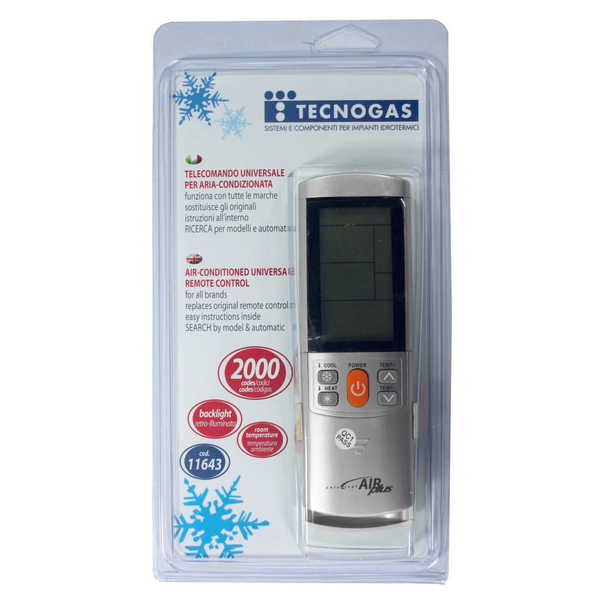Portée 8 m. Adaptable manuellement ou automatiquement à la plupart des climatiseurs du marché, environ 2000. Piles type AAA/1.5V. Dimensions : L.160 x L.58 x P.18 mm