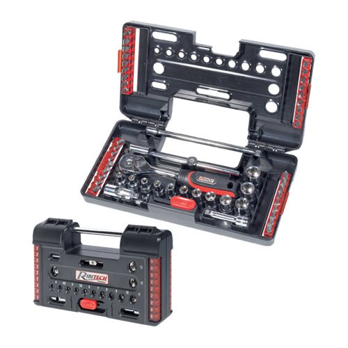 Clés à douille dans mallette 57 pièces. Le coffret comprend : 1 clé à cliquet réversible 1/4" 45 dents. - 12 douilles - 1 joint universel - Rallonge L. 50 mm - Rallonge L. 150 mm. Levier en T et 3 clés Allen : 1,5-2-2,5 mm. Porte-inserts et 36 inserts 25 mm : 8 pour vis à fente, 7 Phillips, 7 Pozidriv, 4 hexagonaux, 6 Torx, 4 carrés