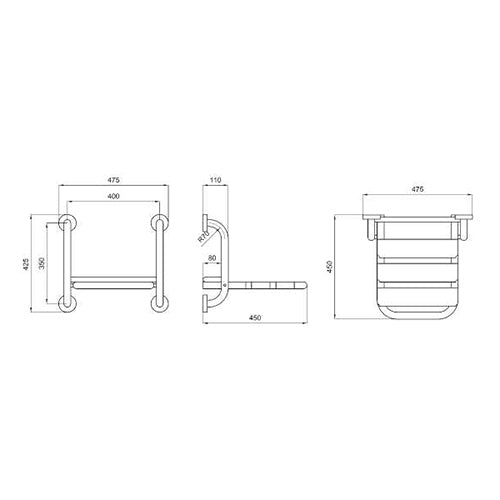 Sedile ribaltabile con struttura in acciaio e fissaggio a muro realizzato in acetalico. Materiale plastico ad altissima resistenza.