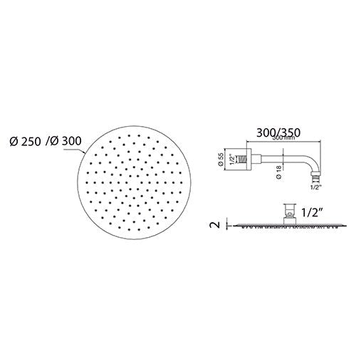 Kit soffione doccia tondo composto da: soffione tondo extra piatto in acciaio inox. Braccio doccia rotondo minimale in ottone. Attacchi 1/2" M. Presa acqua rotonda attacchi 1/2" M x 1/2" M con supporto doccia + flessibile + doccetta tonda.