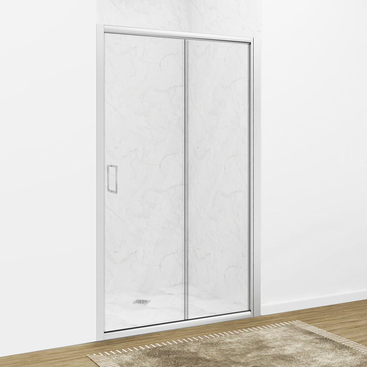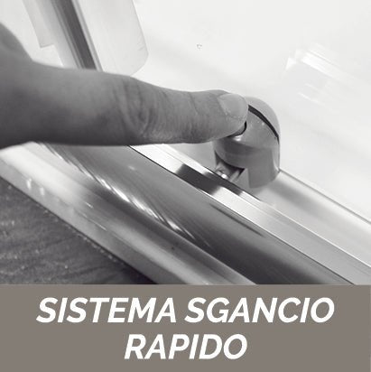 Nicchia per doccia ad un'anta fissa ed una scorrevole reversibili ( 2 cuscinetti a doppio rullo per la guida superiore e 2 cuscinetti monorullo con il pulsante di sganciamento porta per la guida inferiore), in vetro temperato trasparente da 6 mm, profilo cromato, chiusura magnetica, apertura laterale. Tolleranza riducibilità 4 cm. Altezza 190 cm. Prodotto fabbricato conforme agli Standard EN 14428:2004.