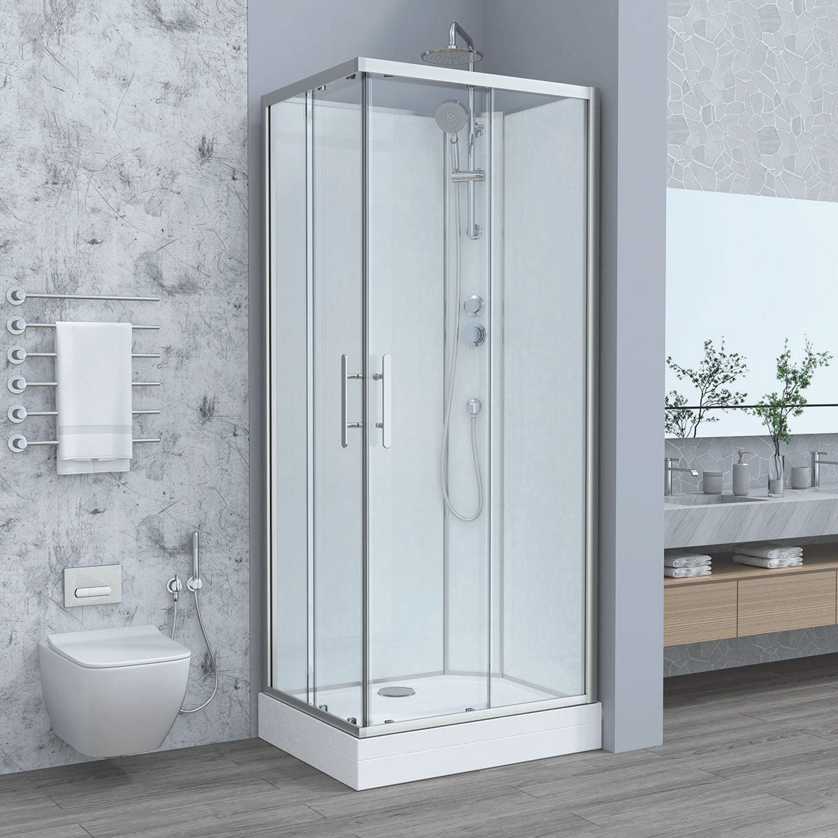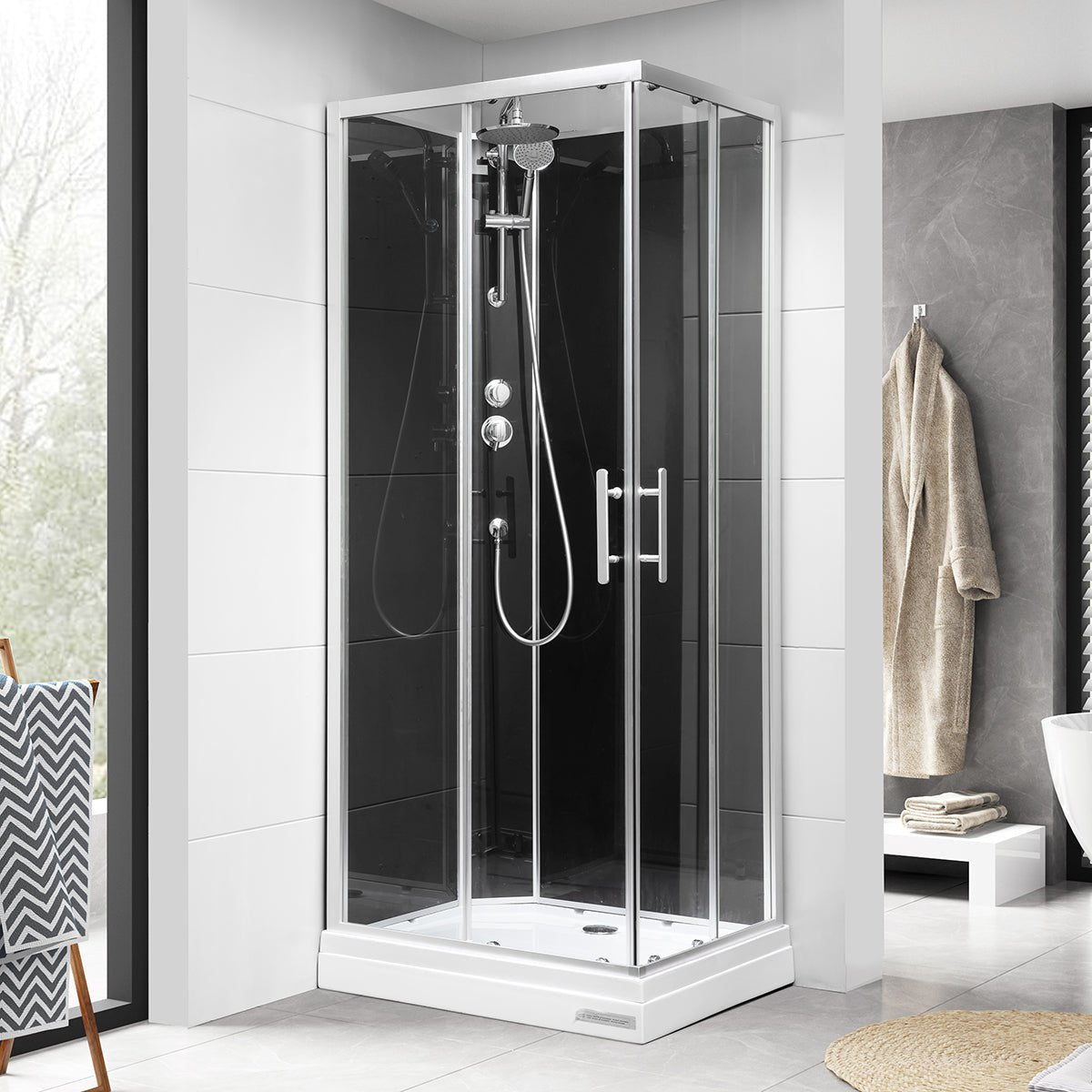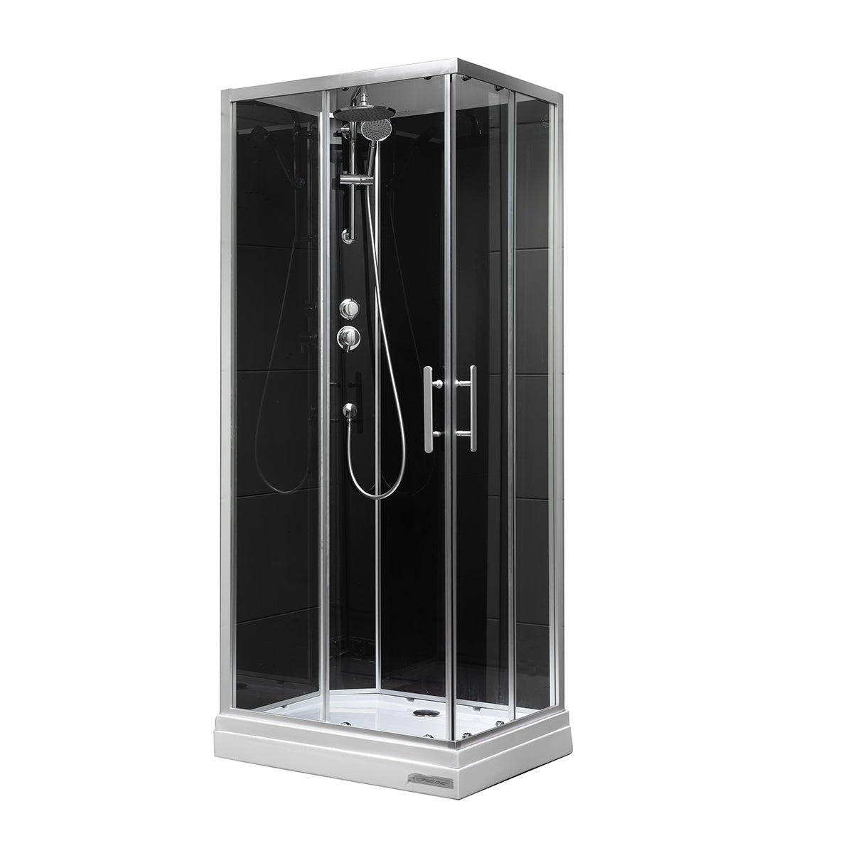 Cabina doccia composta da: vetri frontali temperati trasparenti; vetri posteriori verniciati neri; piatto doccia in ABS altezza 13,5 cm con frontale ispezionabile; profili satinati opachi; colonna doccia ad angolo in vetro nero; doccetta a tre funzioni; soffione con braccio; laccio doccia 1,5 m; miscelatore doccia; deviatore. Spessore vetro 5 mm.