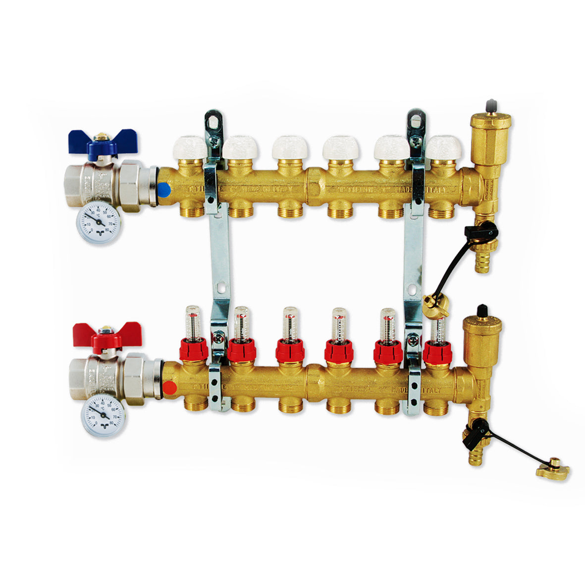 In ottone giallo CW617N, stampato, da 1" derivazioni 3/4" x 18 Eurocono composto da: collettore di mandata e ritorno completi, valvole a sfera a passaggio totale, valvole automatiche di sfogo aria e rubinetti carico e scarico, staffe di fissaggio