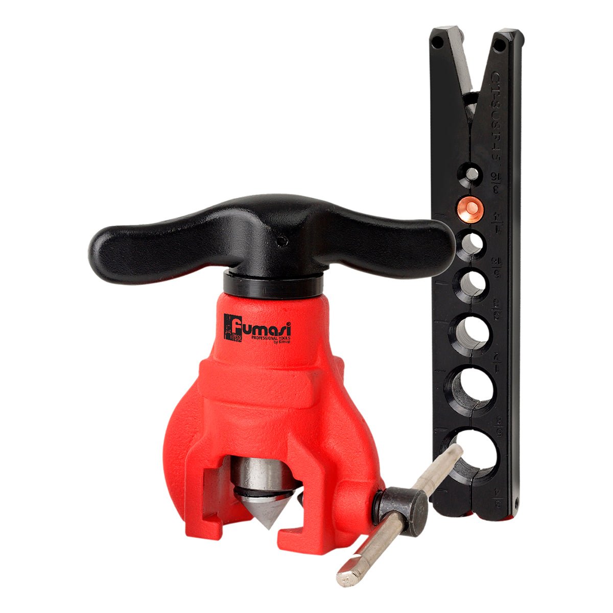Apparecchio per colletti a cricco utile per realizzare bordature uniformi e liscie a 45° tramite un'azione di rotolamento del cono per una deformazione graduale del metallo. Per tubi in rame, ottone e alluminio