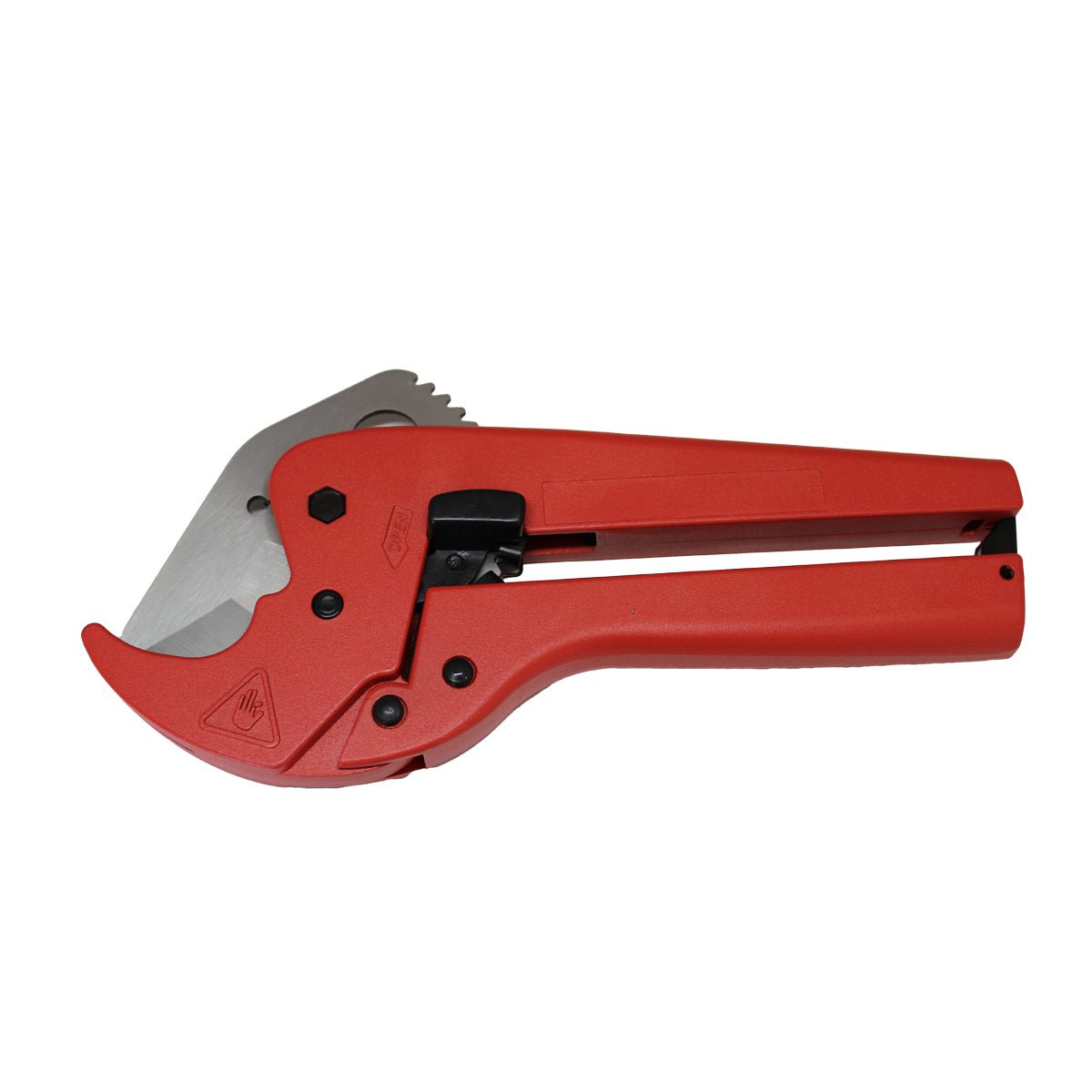 Cesoia per tubi di plastica sino a 42 mm. Avanzamento della lama a cricco, apertura rapida dopo il taglio, con sganciamento automatico, mediante pulsante, gancio di chiusura. Taglio senza sbavature dei tubi di plastica in PE, PE-X, PP, VPE, PB, PVDF, apertura rapida con pulsante