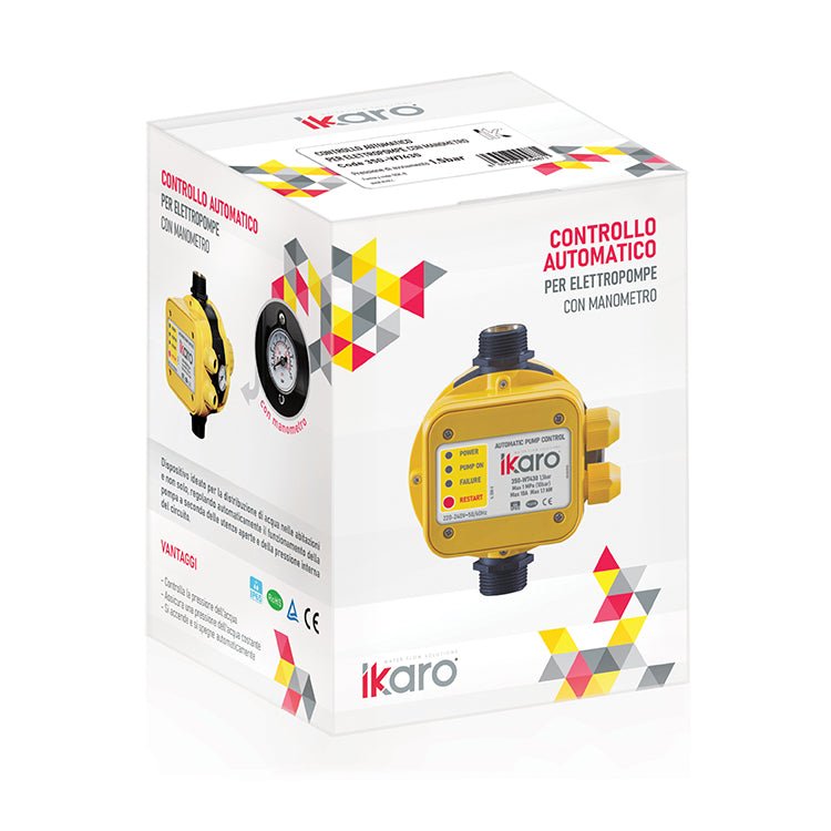 Regolatore automatico per elettropompe con manometro. Alimentazione 220V-240V, 50/60 Hz, IP 65. Adatto a motori di potenza max. 1,5 Hp (1,1 kw) pre pressione max 10 Bar. Temperatura max 60 °. Attacchi 1" maschio. Prodotto certificato corrispondente alle norme R.o.H.s. e TUV