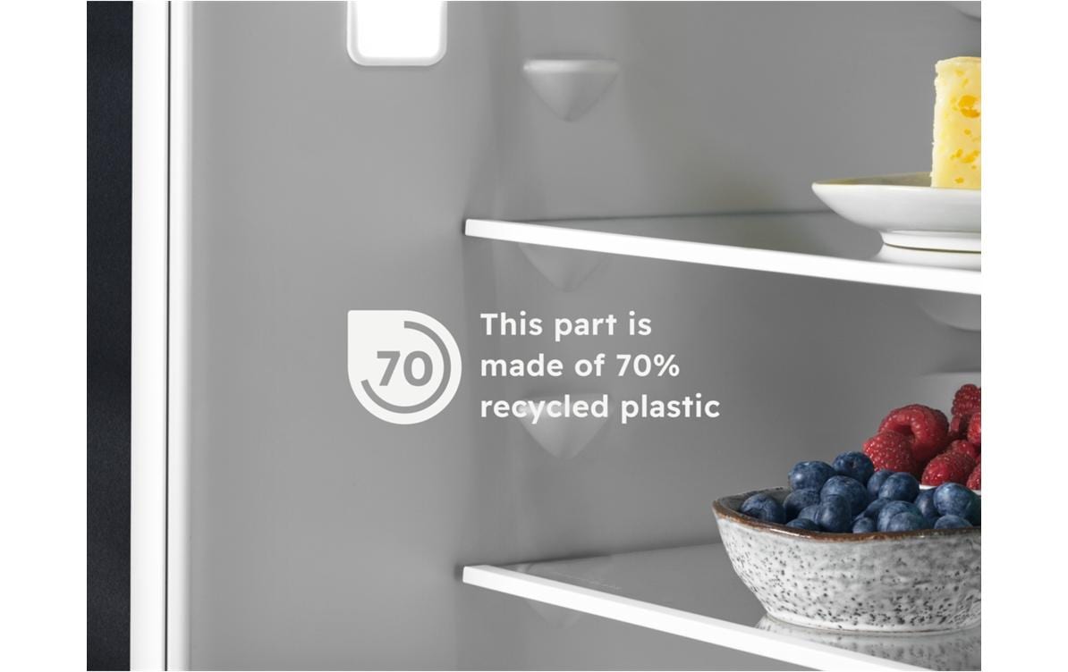 Siamo orgogliosi di presentare la nostra combinazione frigorifero/congelatore con un rivestimento interno realizzato con plastica riciclata al 70%. La plastica dei vecchi frigoriferi viene utilizzata per fabbricare nuovi frigoriferi, contribuendo così a evitare gli sprechi attraverso un'economia circolare.