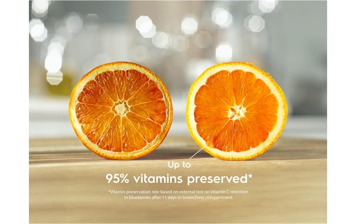 GreenZone+ è il vano portaoggetti ideale. Elimina l'umidità in eccesso e preserva la giusta quantità di umidità per le tue verdure. In questo modo, fino al 95% delle vitamine vengono trattenute dopo 11 giorni proteggendo il prodotto con la giusta quantità di umidità.