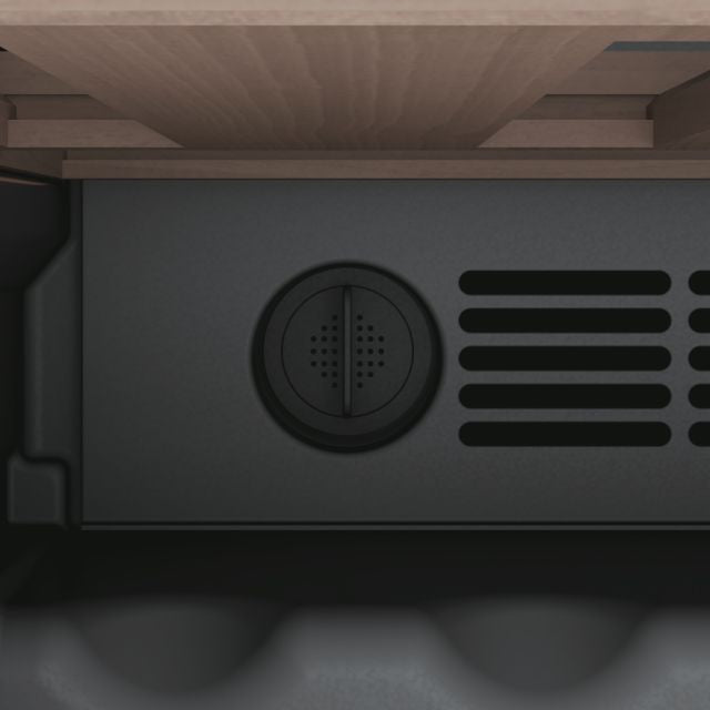 Il filtro a carbone attivo purifica l'aria e il vetro delle porte, opaco ai raggi UV, minimizza i cambiamenti indesiderati di colore e sapore del vino.