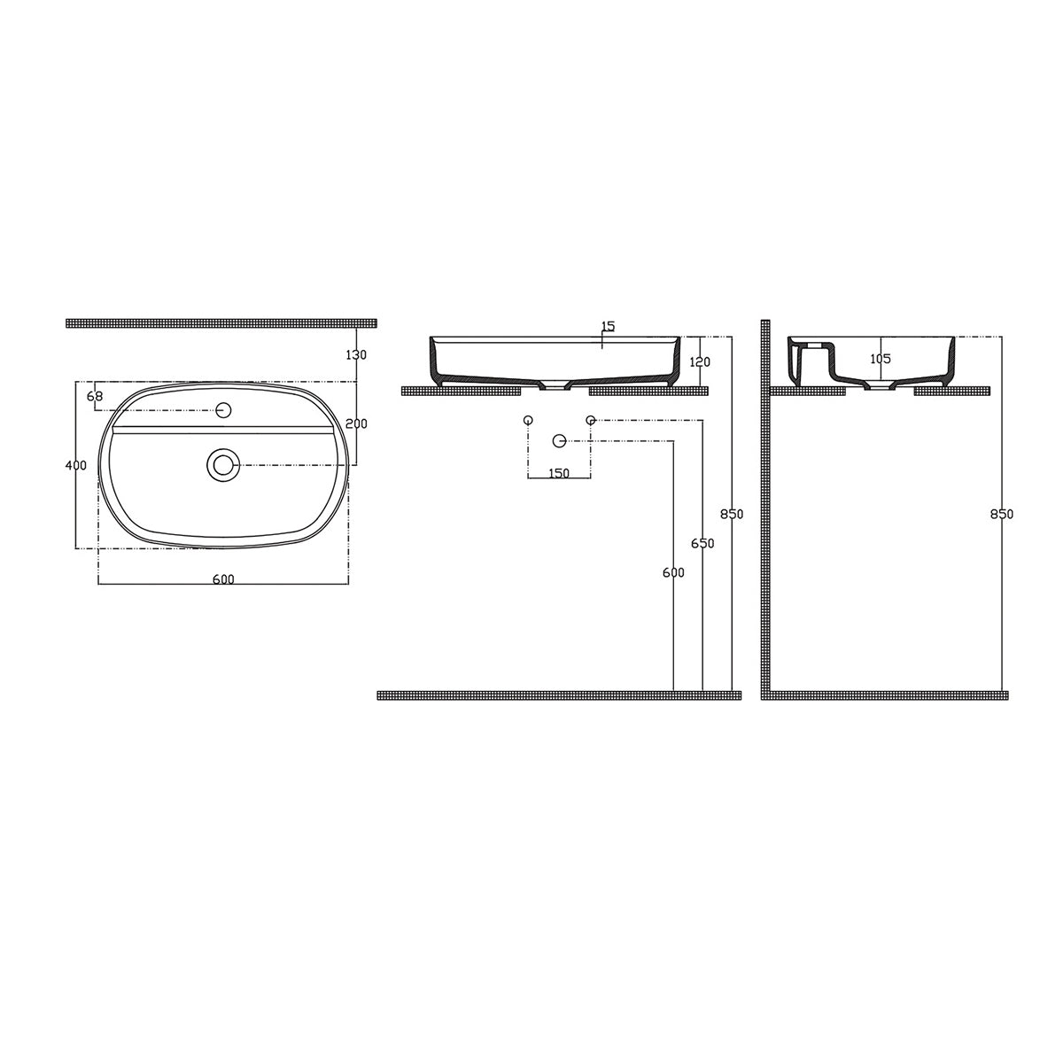 Lavabo d'appoggio in ceramica Infinity con foro rubinetto. Bordo ultra sottile 5 mm, misure 60x40 cm. Senza troppopieno, fornito senza piletta. Collezione esclusiva disponibile in 13 finiture