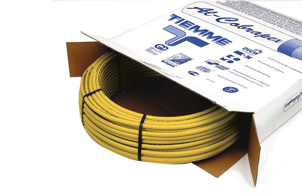 Tubo multistrato giallo nudo per uso gas corrispondente alla Norma numero: UNI/TS 11344:2009 - Codice ICS: 83.140.30. Prezzi indicati al metro