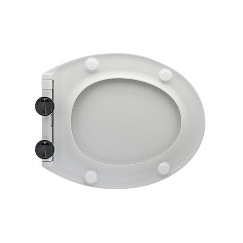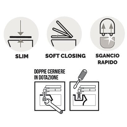 Sedile (Forma tipo 1) universale, termoindurente, slim. Dimensioni: Lunghezza cm 41-45,5; Larghezza cm 37,5; Interasse cerniere cm 6-17,5. Mod. con cerniere regolabili e doppio fissaggio tipo A e C - Soft Close. A sgancio rapido.