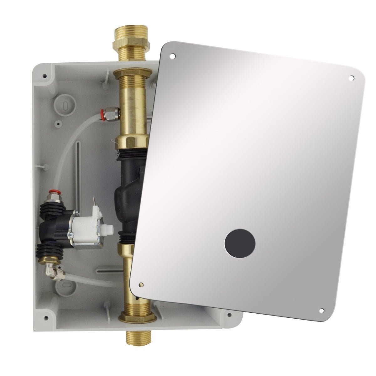 Flussometro da incasso per wc con comando a fotocellula funzionante a pile; il flussometro viene fornito di tutto quanto necessario per una corretta installazione: scatola da incasso con elettrovalvola, piastra in acciaio inox 230 x 180 con fotocellula e scheda elettronica, scatola porta pile, pile al litio 6 volt 1300 mAh