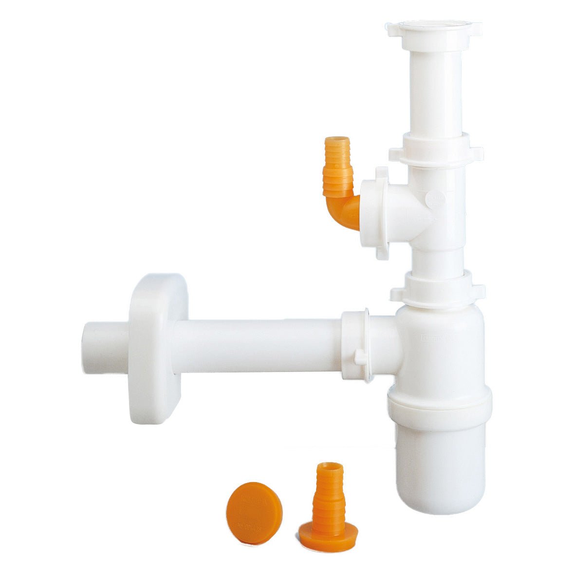 Sifone a bottiglia per lavelli ad una vasca senza piletta, compelto di raccordi. Con attacco lavastoviglie Diam. 20-25 a 60°